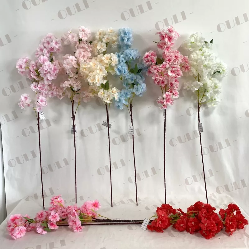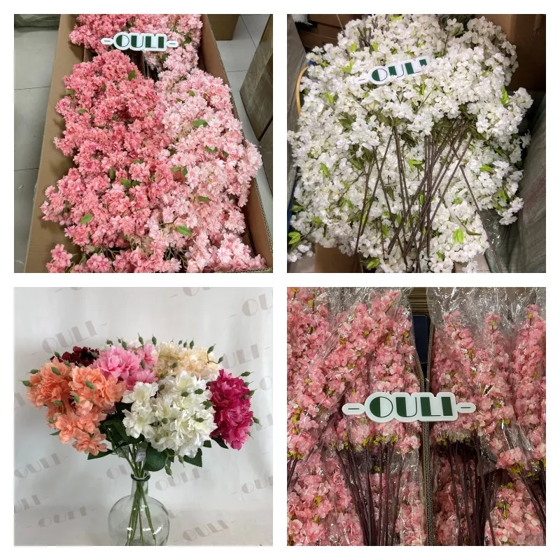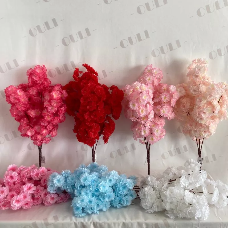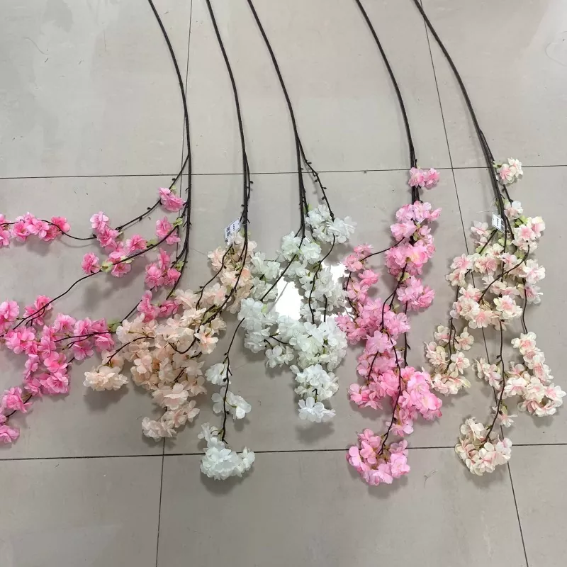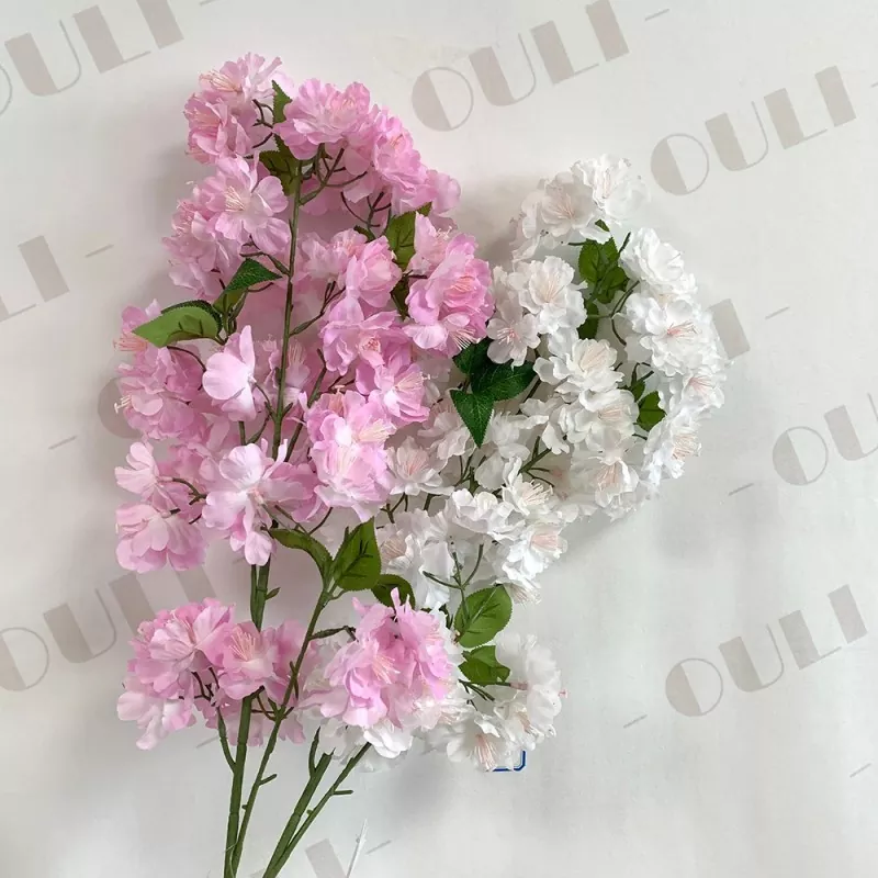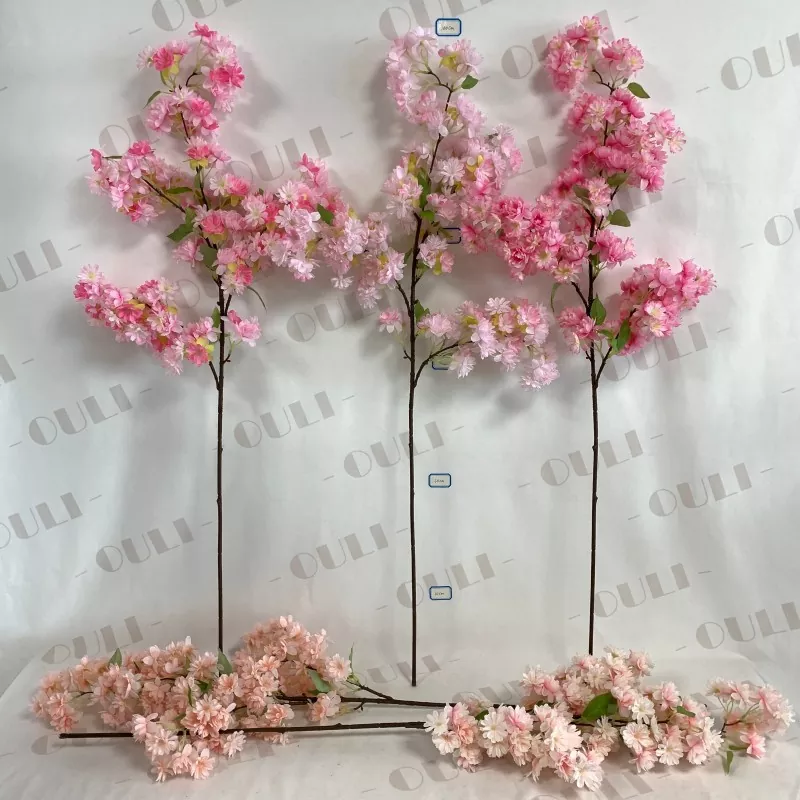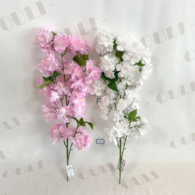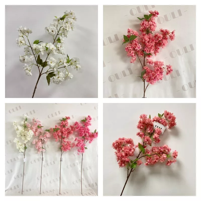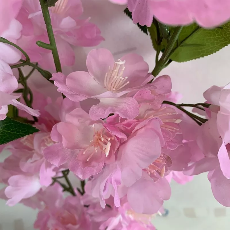 कृत्रिम चेरी ब्लॉसम शाखांमध्ये रेशीम पाकळ्या, गुलाबी पुंकेसर, पाच-ब्रांच शाखा आणि हिरव्या पानांचे चार संचाचे तीन थर आहेत. अंदाजे cm 63 सेमी (अंदाजे २ इंच) उंच उभे राहून, हे घर सजावट आणि लग्नाच्या व्यवस्थेसह विविध सेटिंग्जसाठी योग्य आहे.
