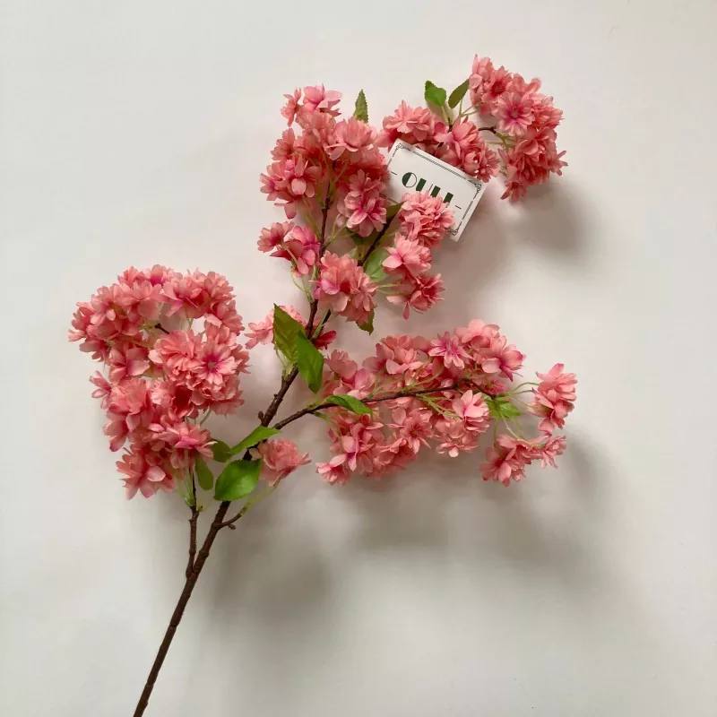 या कृत्रिम चेरी ब्लॉसम शाखेत एकाधिक फ्लॉवर फोर्क्स आणि हिरव्या पानांचे चार संच आहेत, ज्यामुळे एक कर्णमधुर आणि समृद्ध लेयरिंग तयार होते.